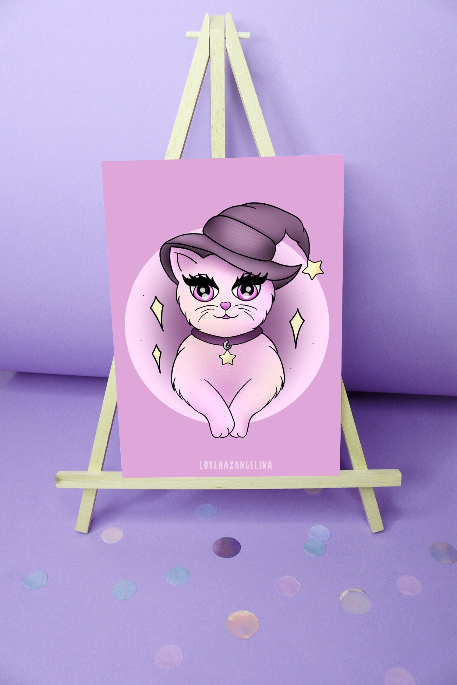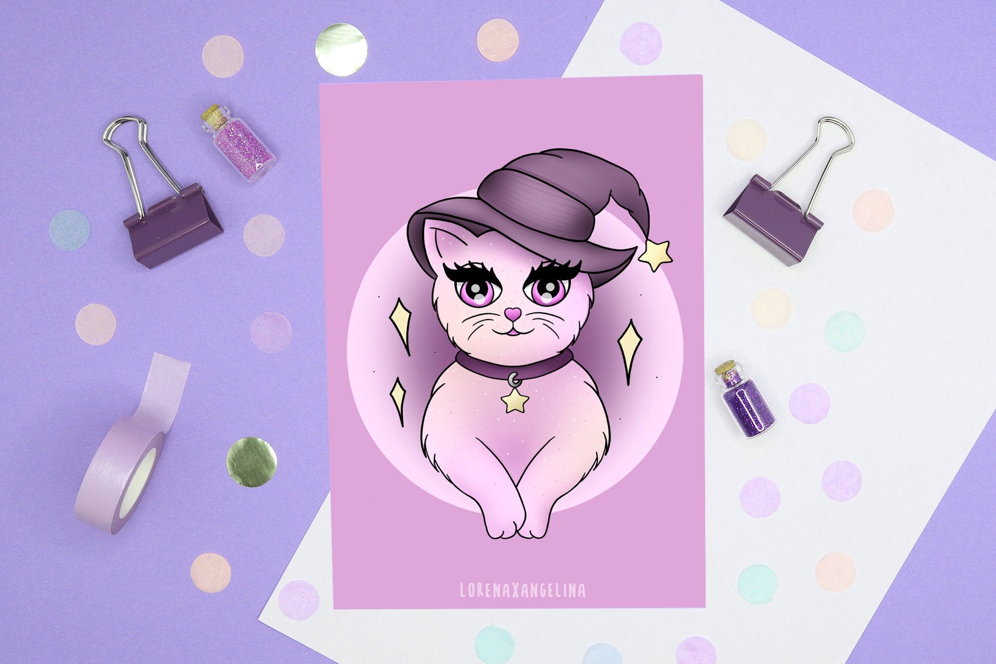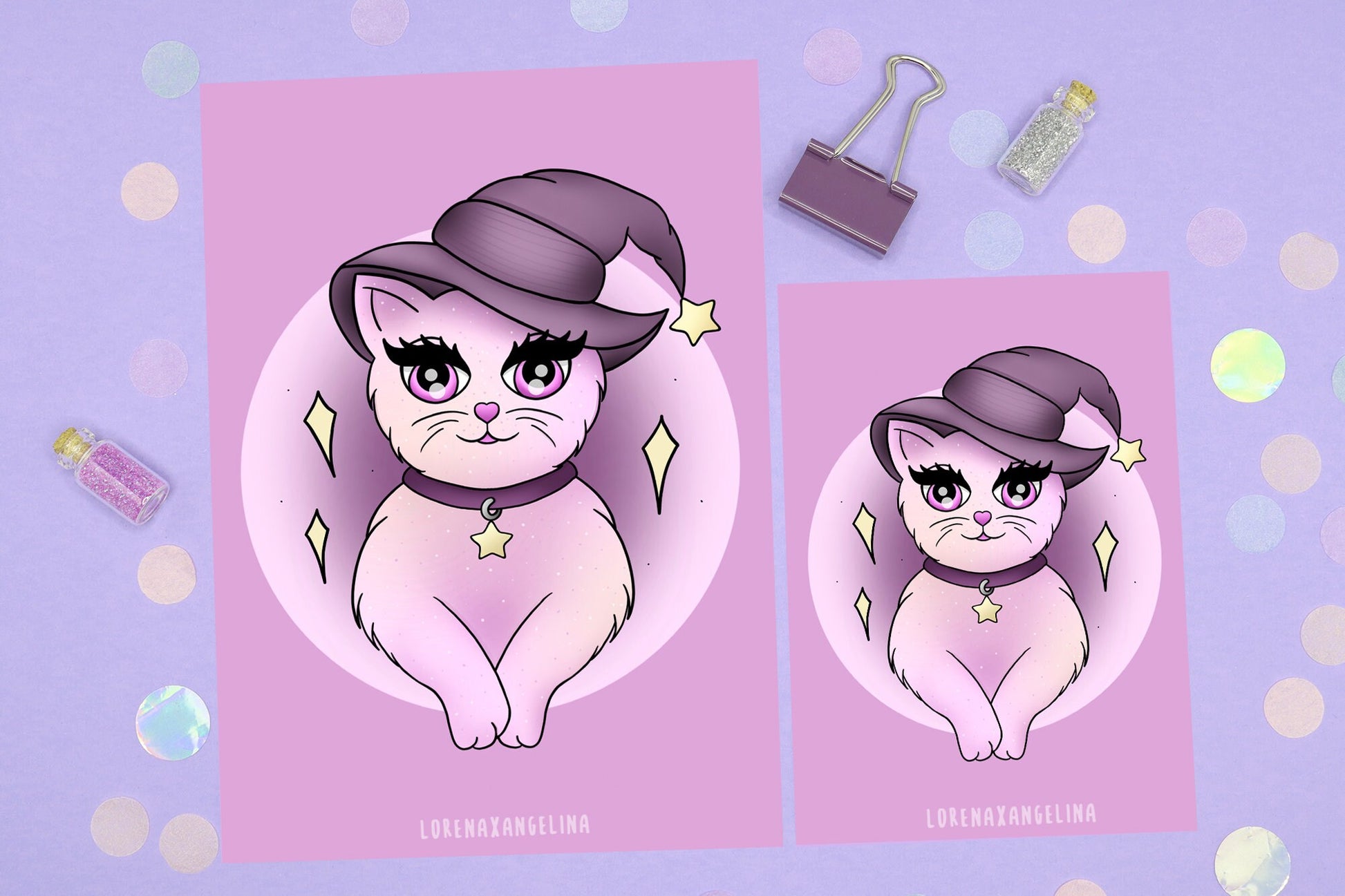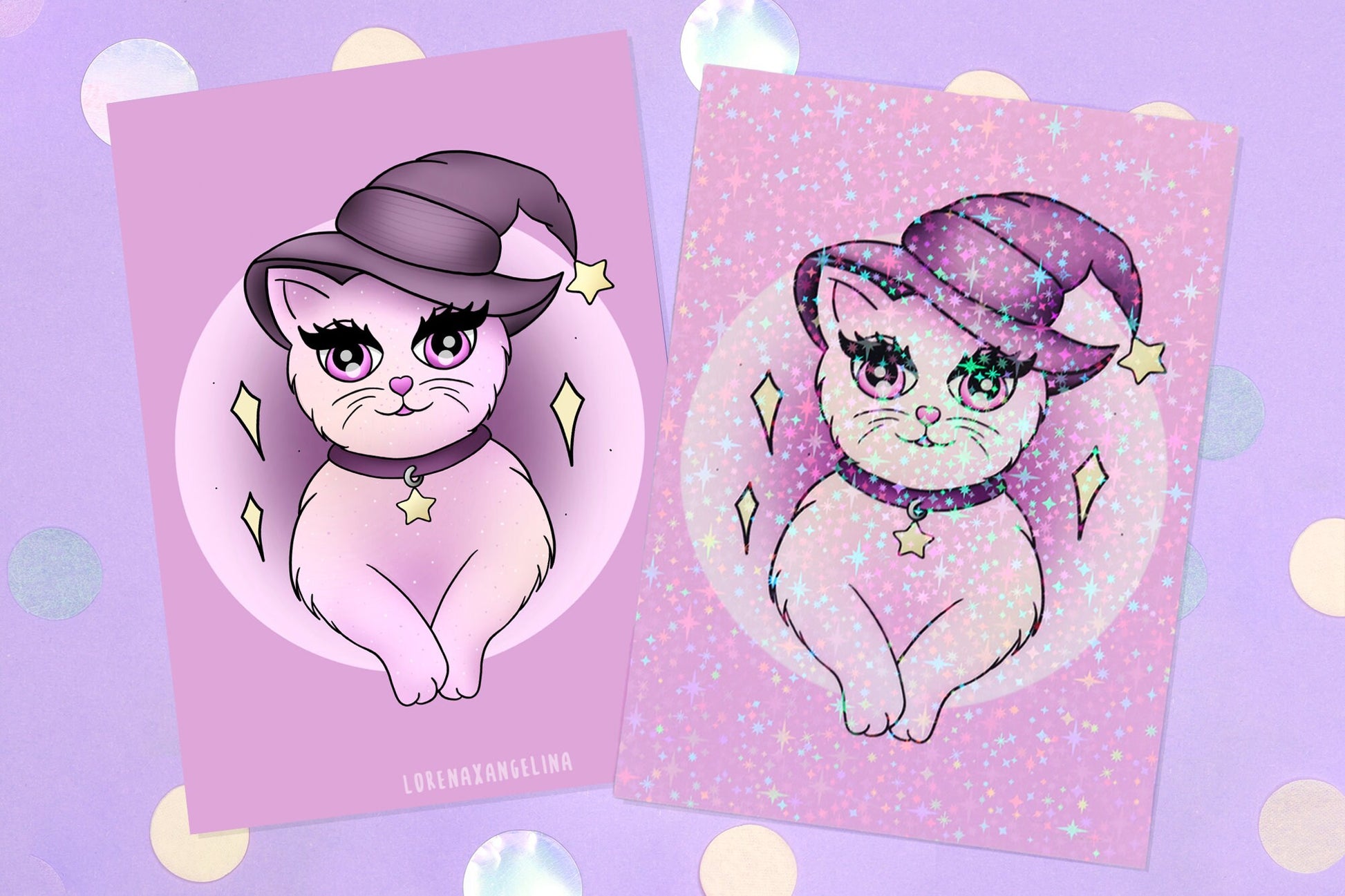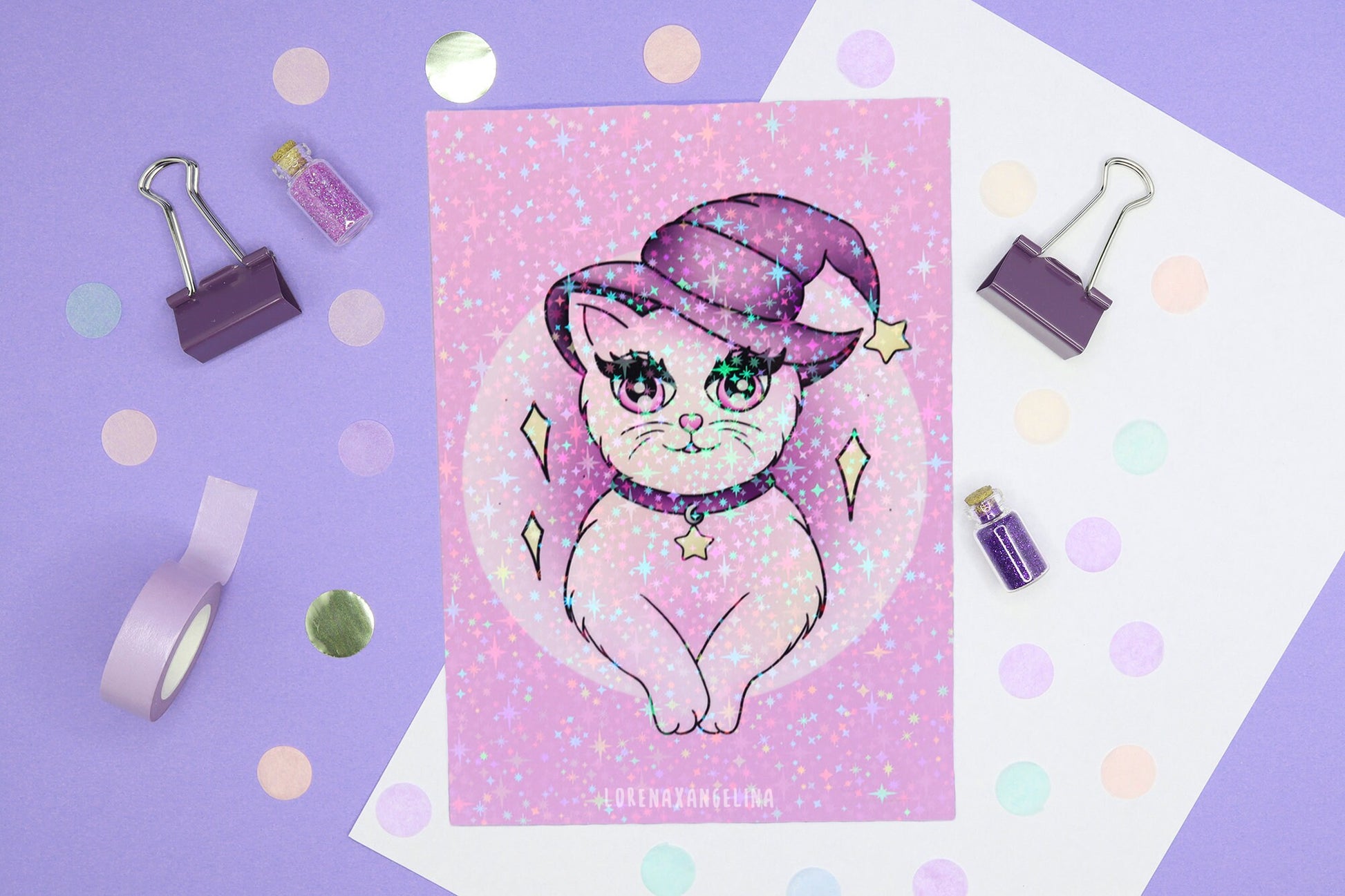 Hochwertiger Kunstdruck mit meiner "Witchy Cat" Zeichnung. Nach Wahl auch mit tollem Stern-Holographic Effekt! Auf premium 280g/m² Fotopapier gedruckt. (Ohne Wasserzeichen)
