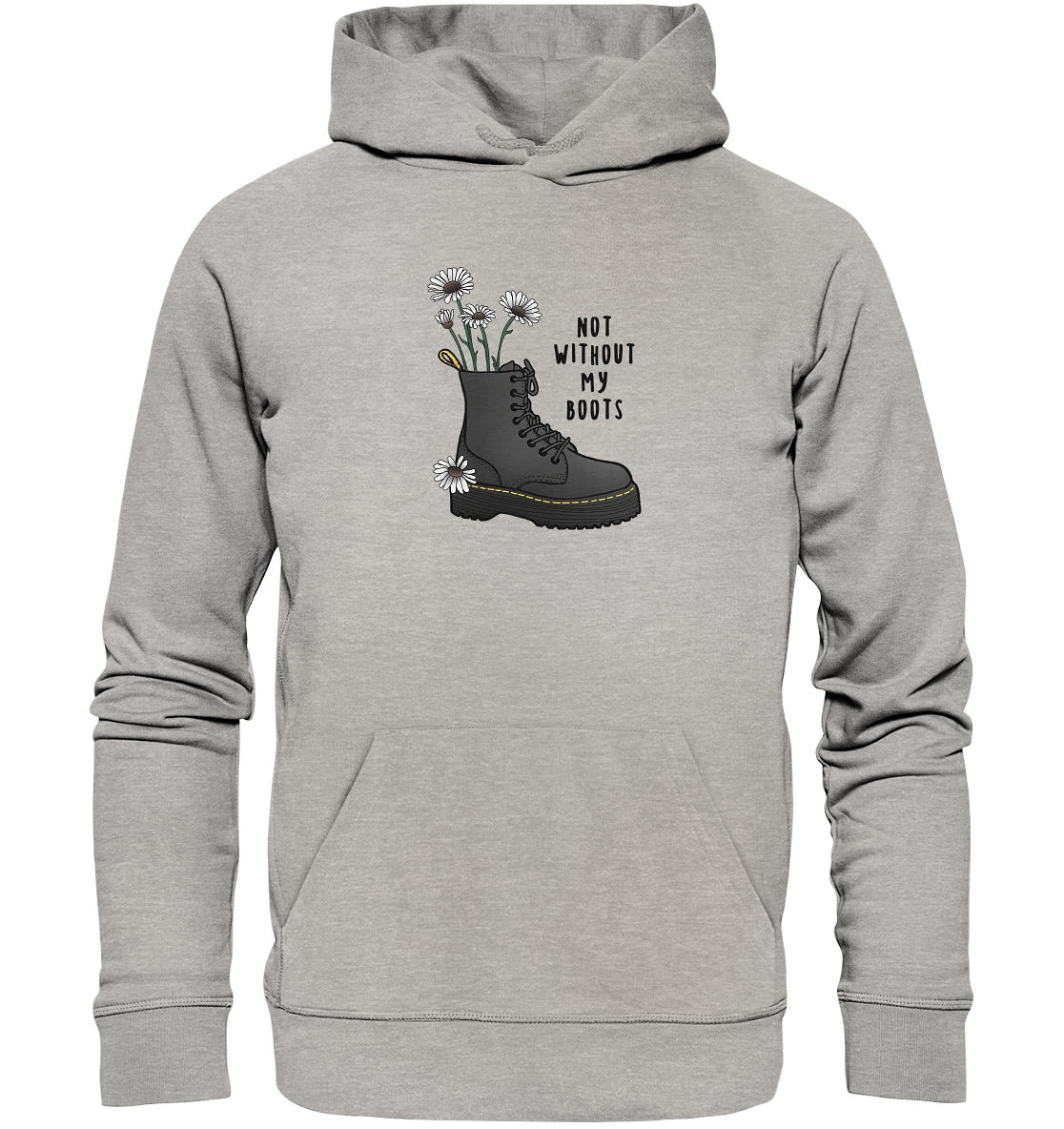 Nachhaltiger Hoodie mit meiner Flower Boots Zeichnung aus u.a. Bio-Baumwolle. Durch den qualitativ-hochwertigen, dicken Stoff und der gebürsteten, weichen Fleece-Innenseite ist er super bequem und hält kuschlig warm. Der Druck auf der Vorderseite mit dem Spruch "Not without my boots" sorgt für einen besonderen Hingucker. Die integrierte Bauchtasche, sowie die Kapuze sorgen für einen lässigen und bequemen Look. Weitere Infos über die Materialien findest du unter "Produktdetails".