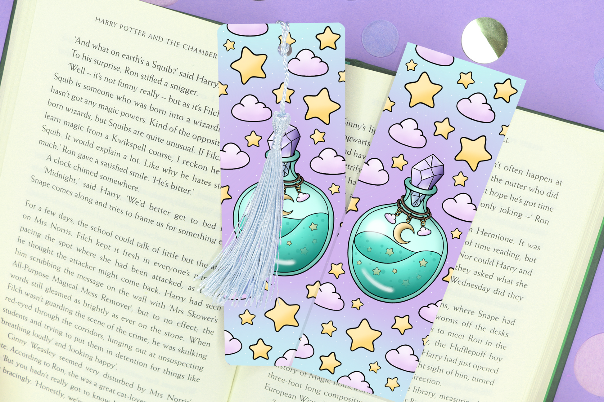 Dieses dreamy Lesezeichen in pastell lila und türkis Tönen ist mit süßen Sternen und Wolken verziert, sowie einer witchy Potion (Zaubertrank).