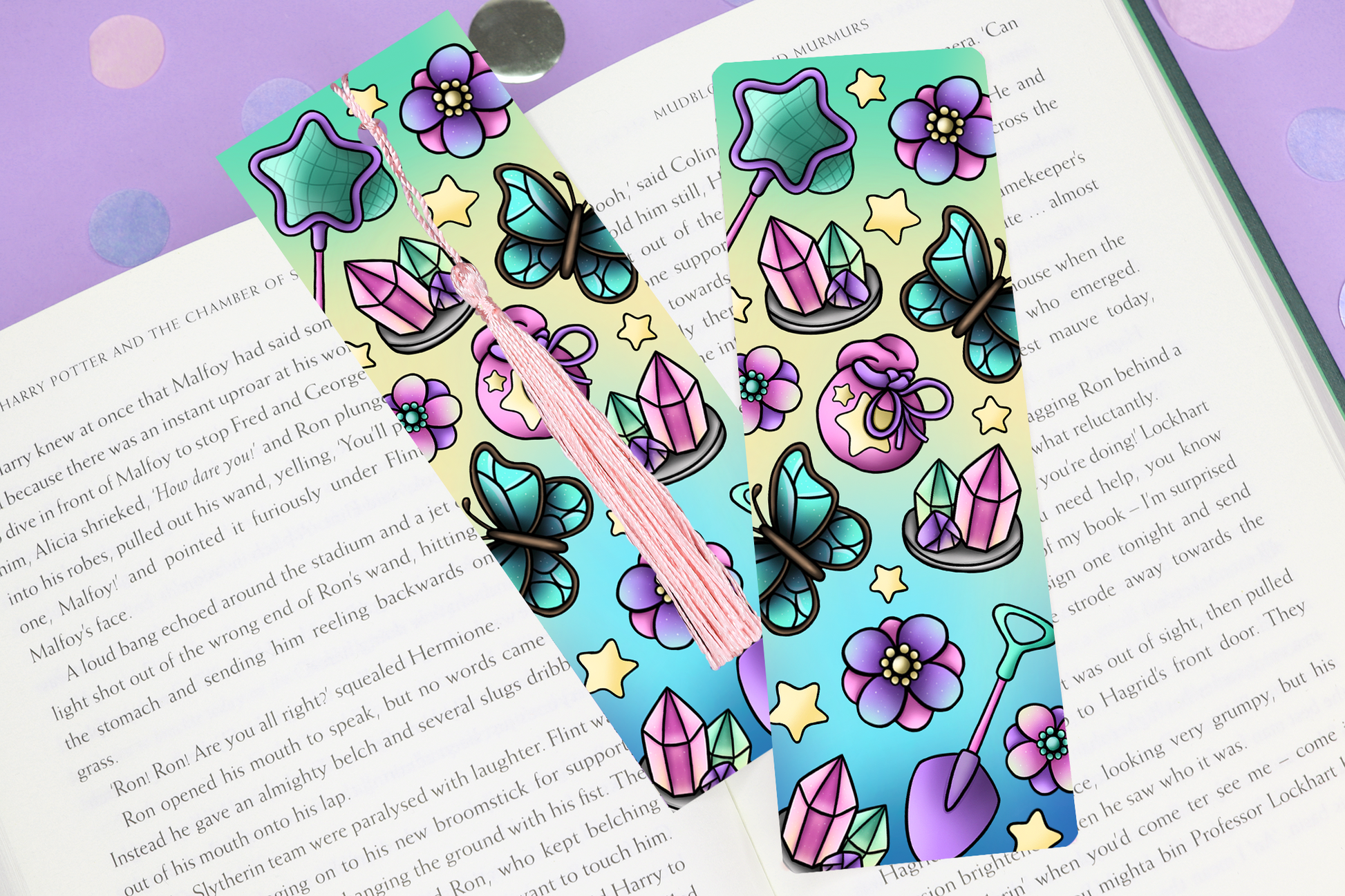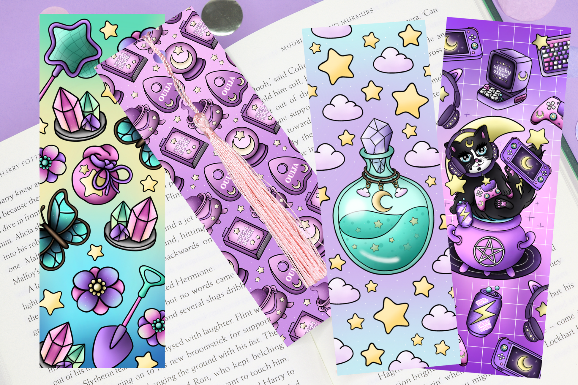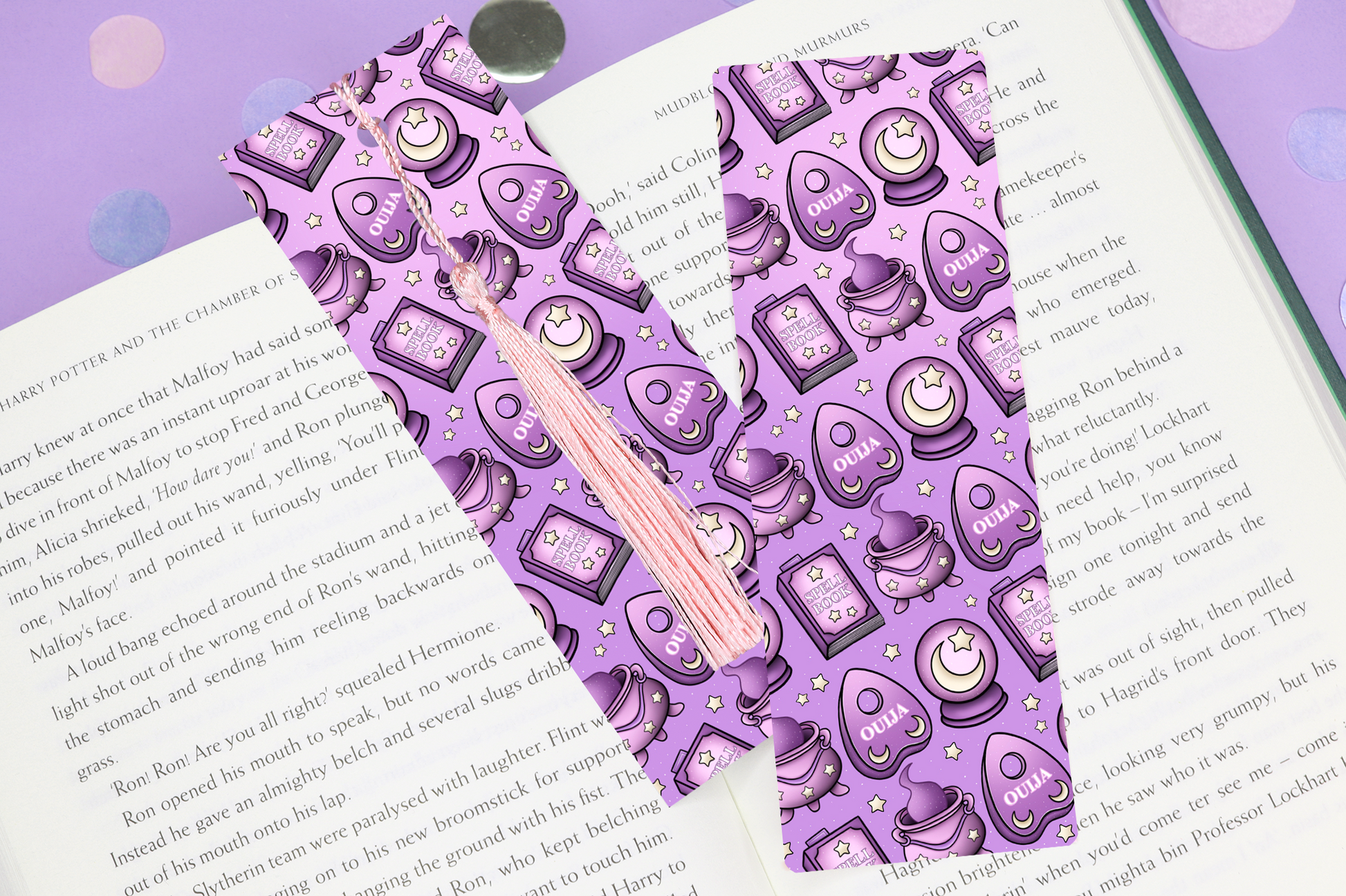Dieses süße, kawaii, pastell Lesezeichen ist im rosa-lila Farbton und mit Sternen verziert. Darauf abgebildet sind Hexenutensilien, wie ein Hexenbuch, Hexenkessel, Kristallkugel, Ouija Board (Hexenbrett) und passend dazu eine Planchette.