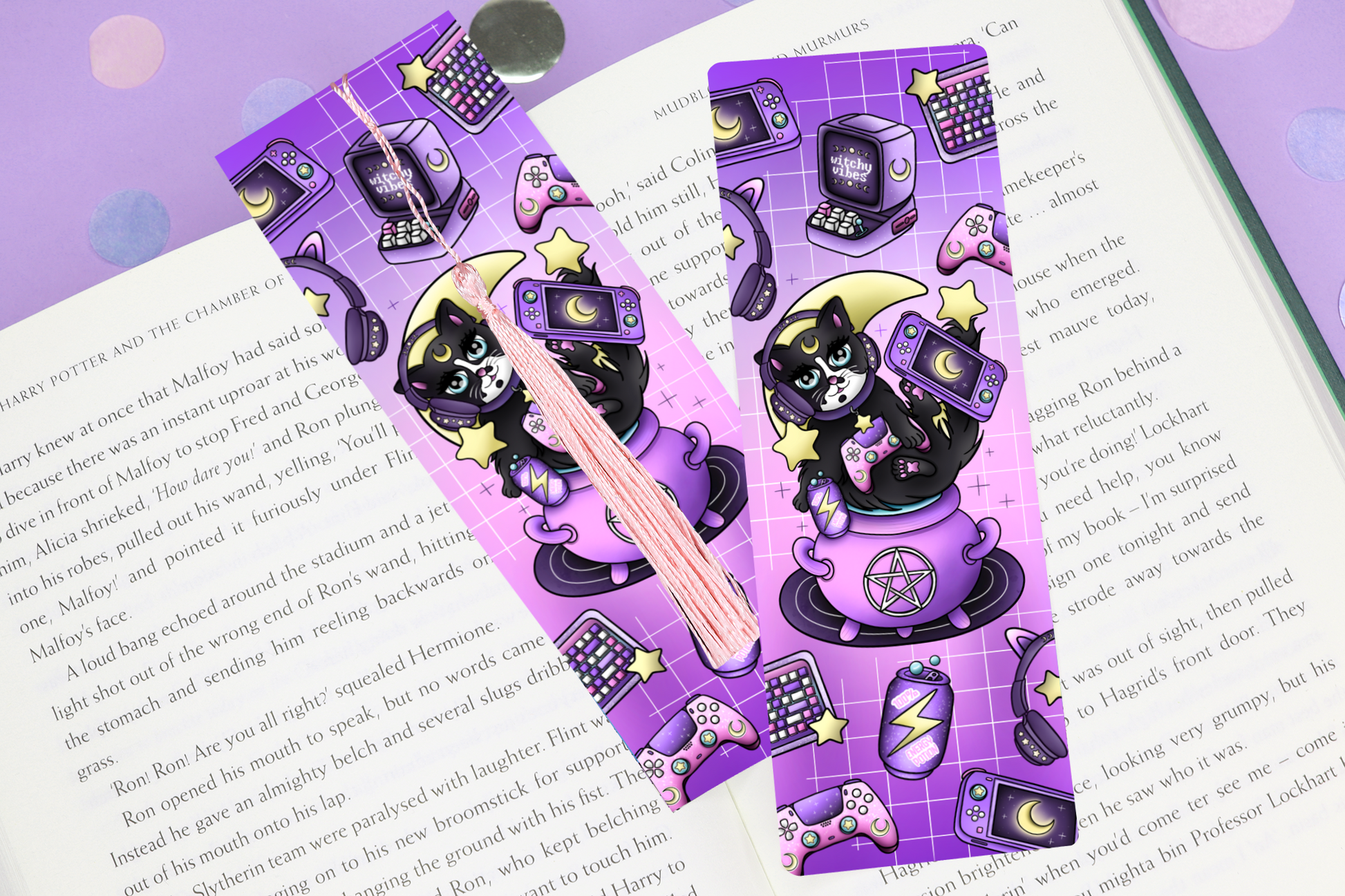 Dieses Gaming Lesezeichen im lila-rosa Farbbereich ist mit witchy Gaming Motiven für witchy Live-Streams verziert, perfekt für Twitch Streamer und Cat Lover! Eine Hexenkatze im Hexenkessel mit Energy Drink (Potion), Switch Gaming Konsole, Mini Computer, Headset und PS5 Controller.