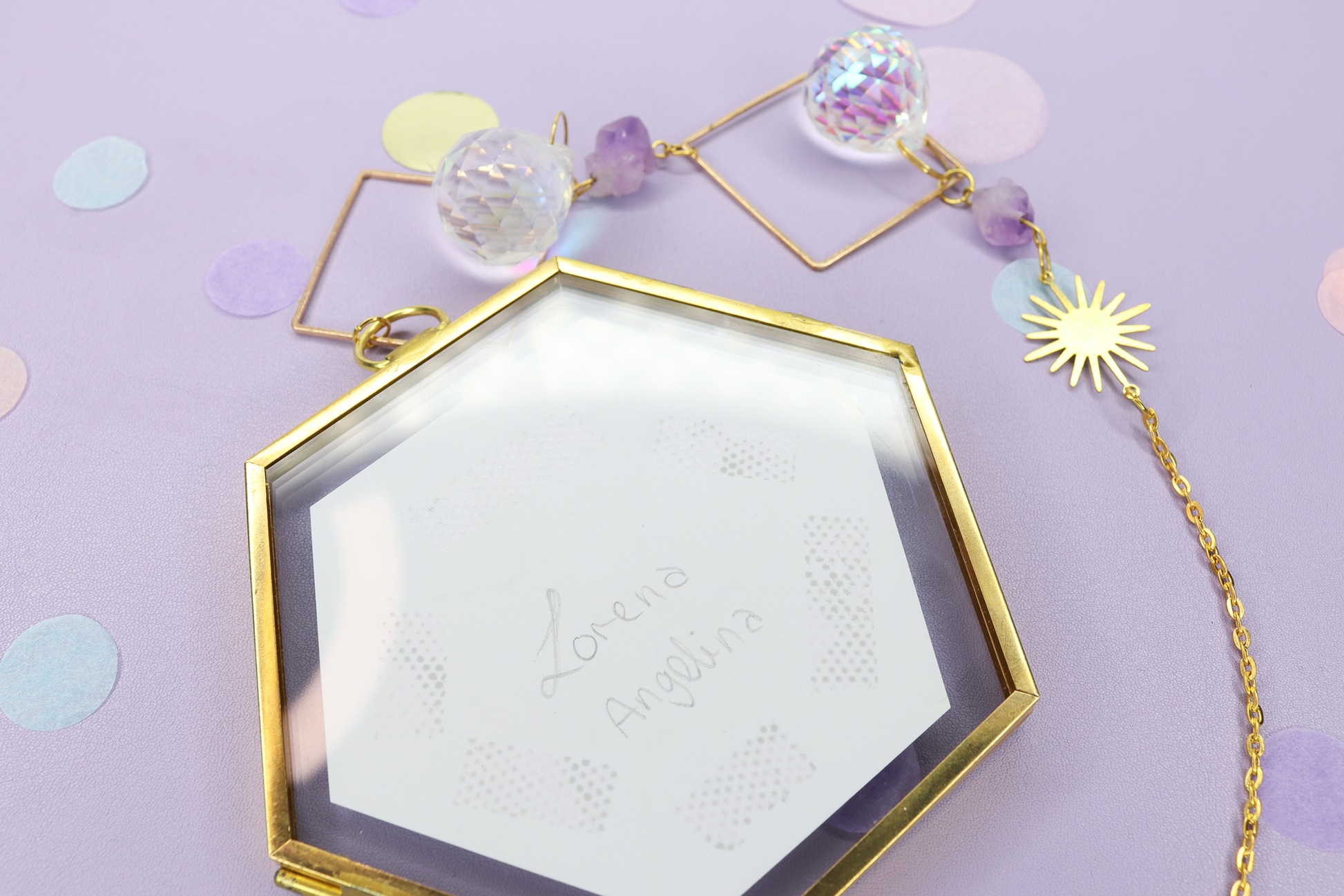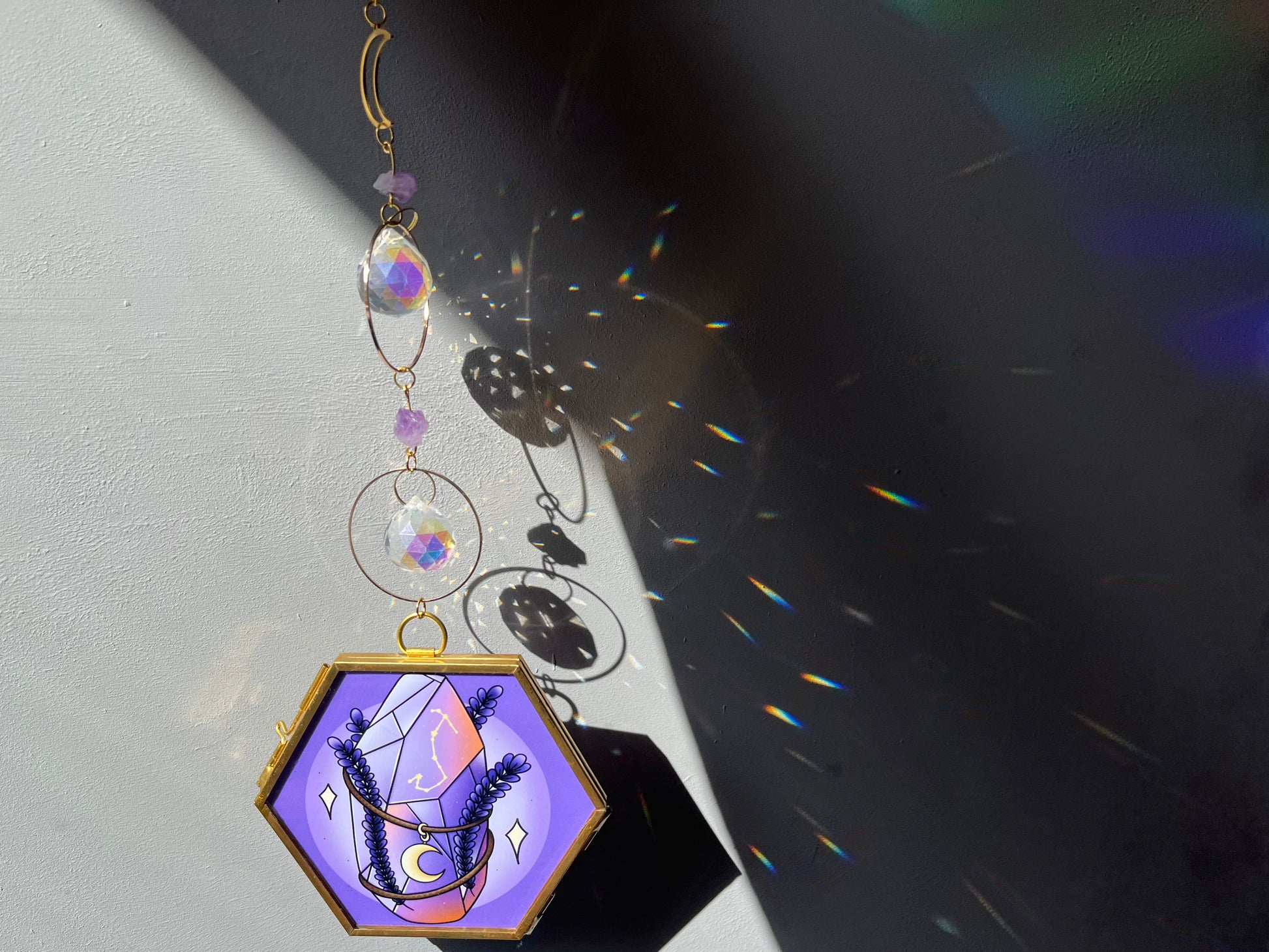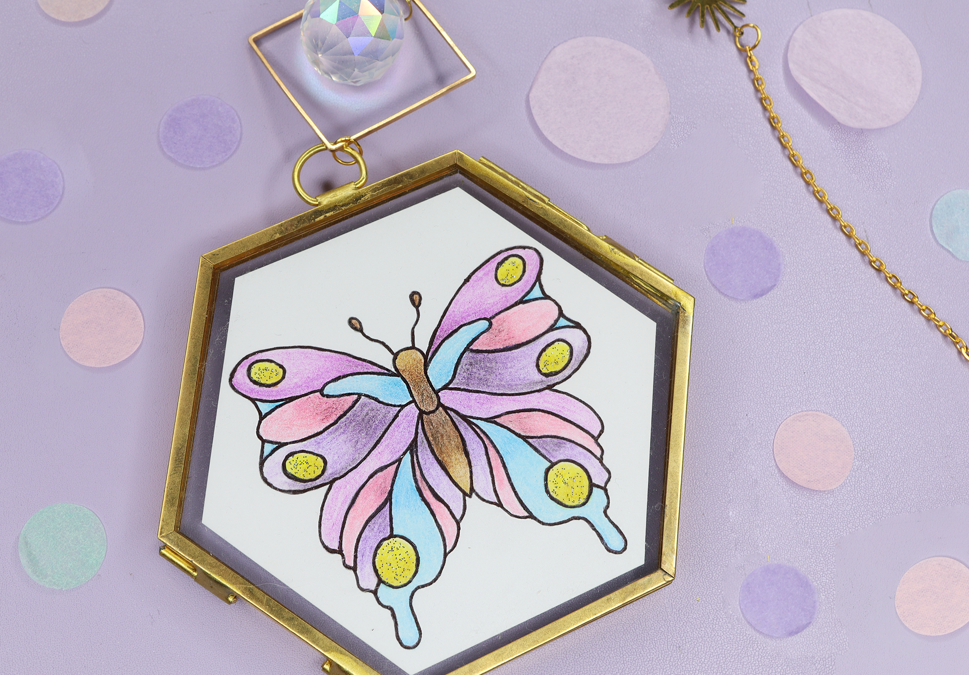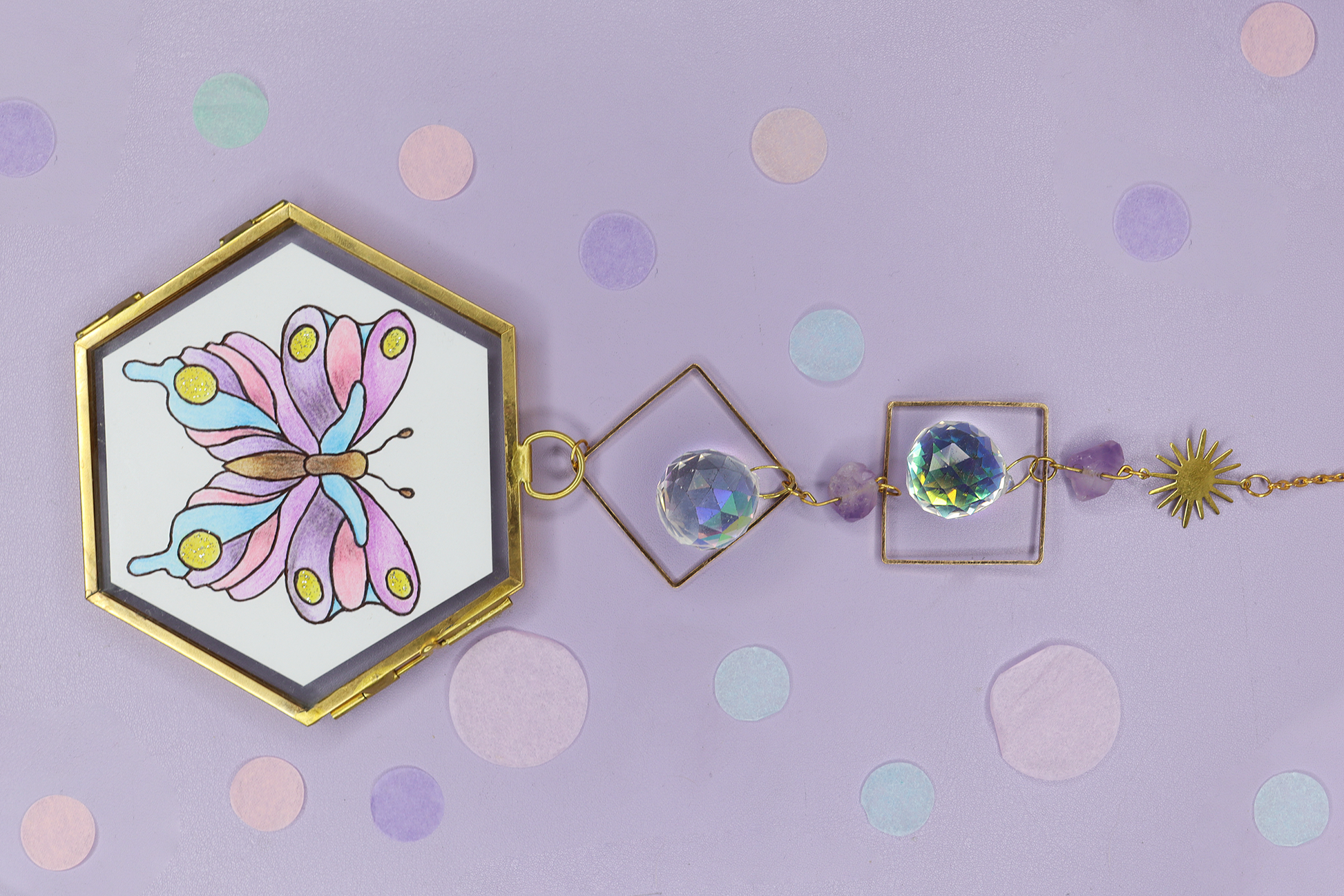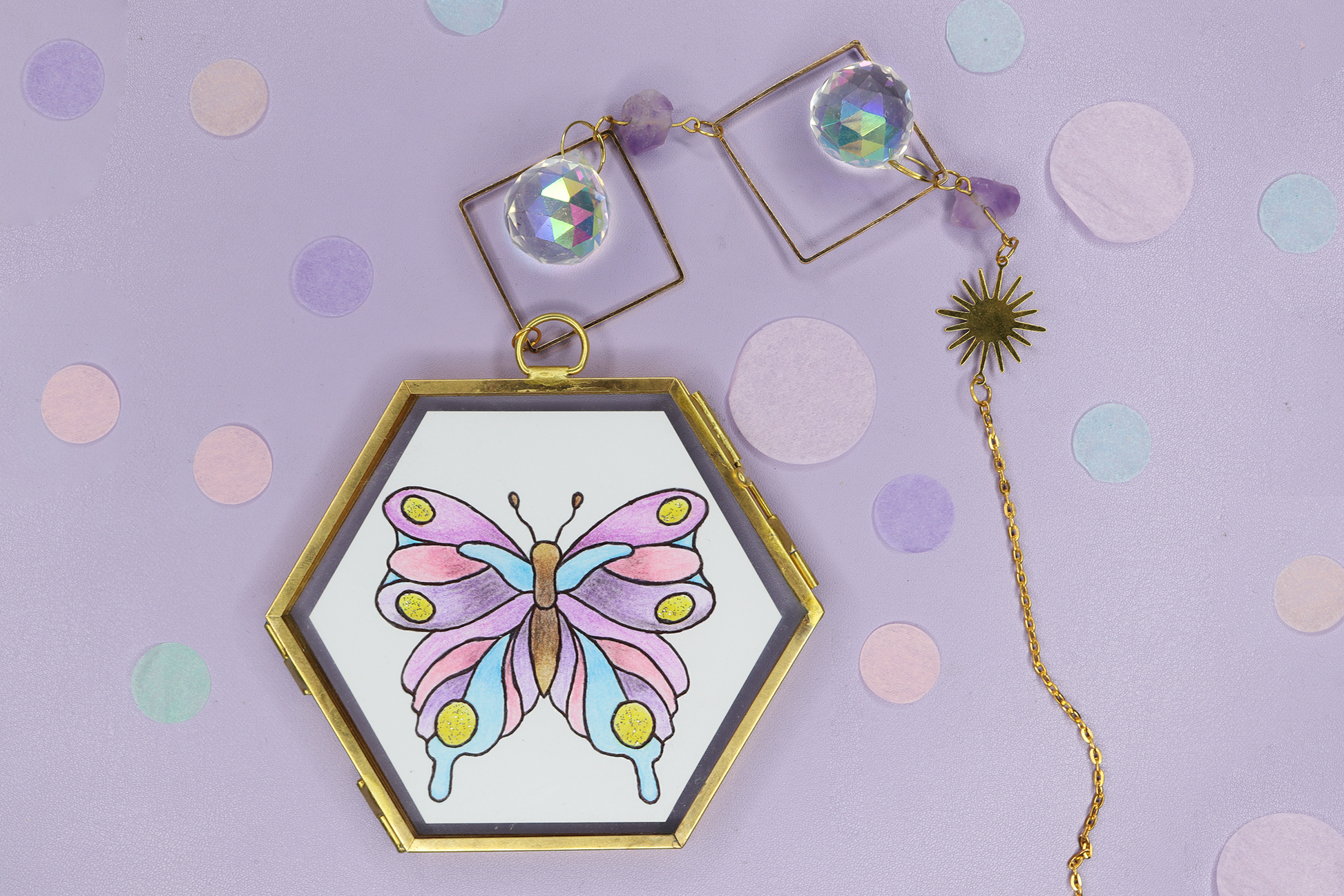 Wunderschöner Suncatcher mit einem Glas-Bilderrahmen. Die goldene Kette mit Sonnen-Anhänger, Kristallen und kleinen Amethyst Edelsteinen sorgt für einen magischen Hingucker. DIe originale Bleistift-Zeichnung stellt einen bunten Schmetterling da, der mit Glitzerdetails verziert wurde. Hänge den Suncatcher in die Nähe eines Fensters, sodass die funkelnden Kristalle einen schönen Regenbogen-Effekt in dein Zimmer zaubern.