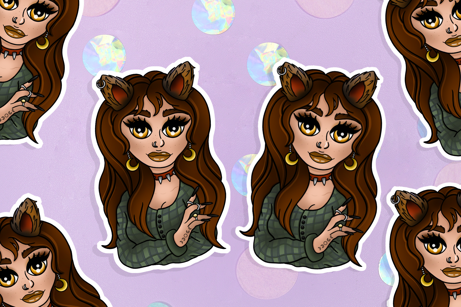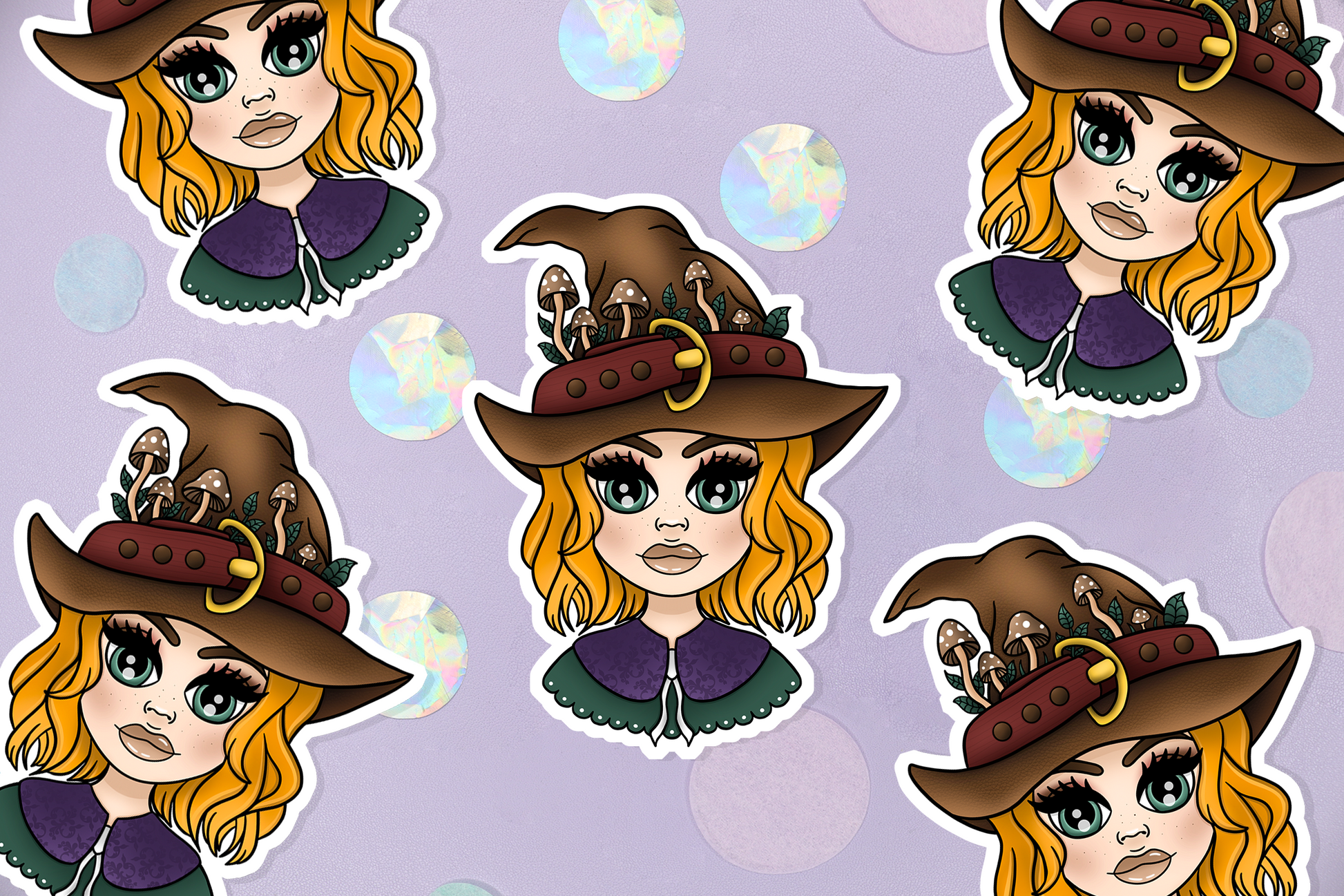 Dieses herbstliche Hexen-Portrait im Comic Style in natürlichen orange-braun Tönen, welches mit einem Hexenhut und Pilzen verziert ist, passt perfekt zu deiner witchy Sticker Sammlung.