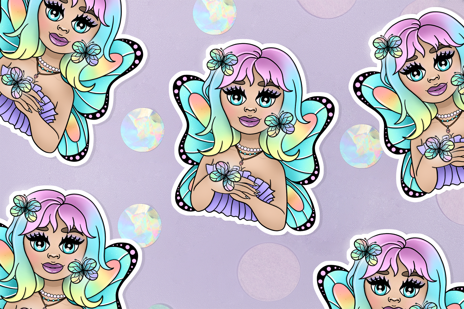 Dieses Schmetterlings-Feen-Portrait in wunderschönen Regenbogen Farben ist perfekt, um zum Beispiel eine Wasserflasche, Notizblock oder Laptop zu dekorieren.