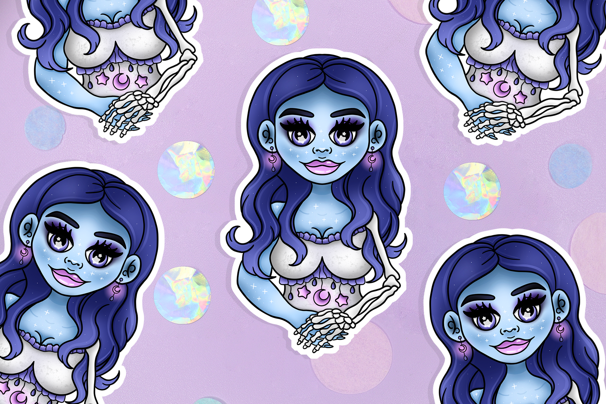 Dieses gruslige Geister-Portrait mit Skeletthand ähnelt einer Corpse Bride und ist perfekt für deine creepy Sticker Sammlung.