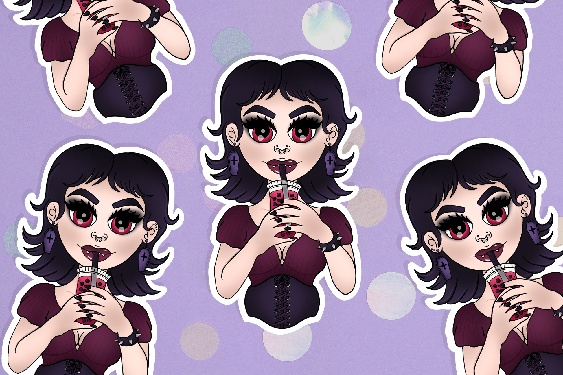 Dieses moderne Vampir-Portrait im Comic Style ist mit einem Bubble Tea versehen. Perfekt für alle Horror Fans.