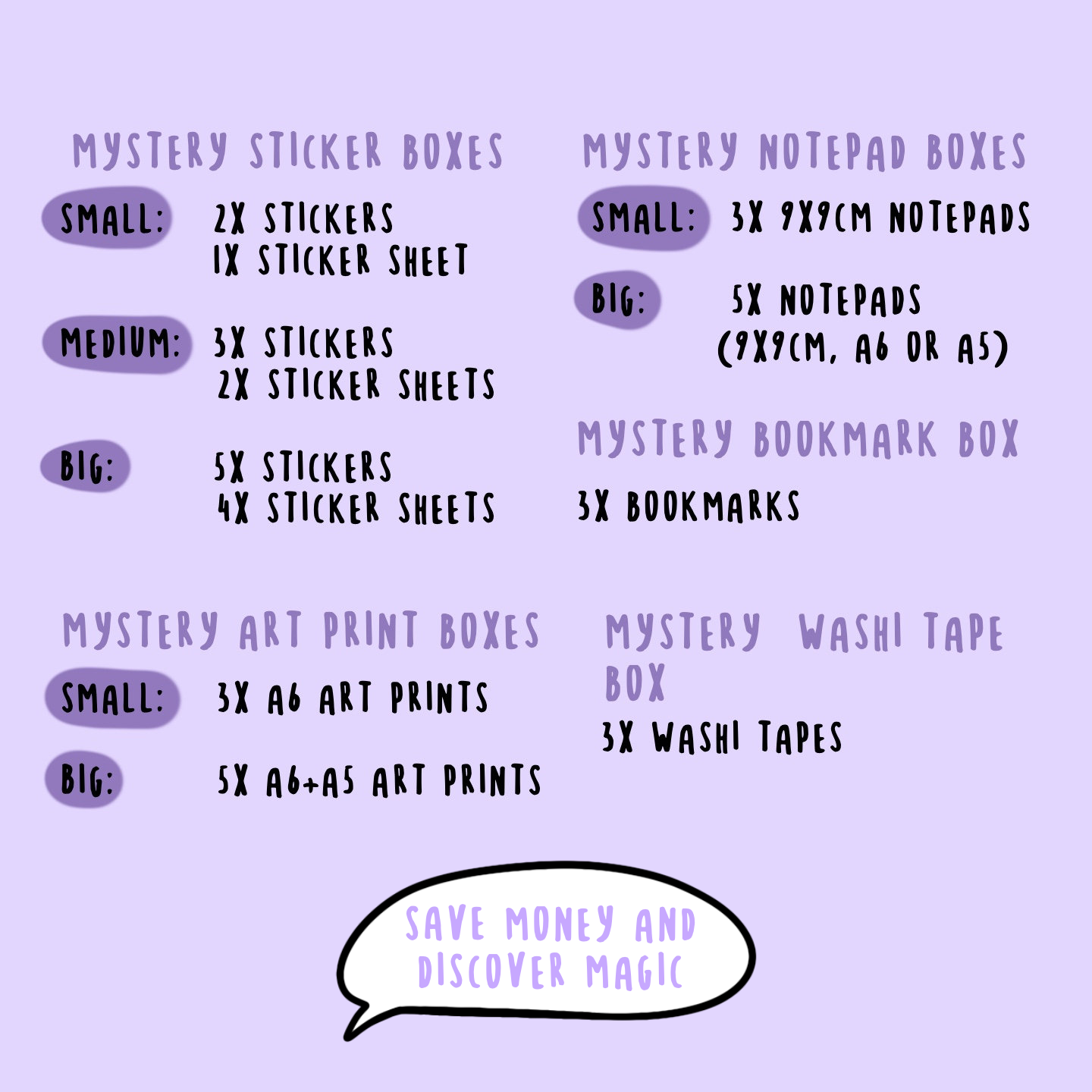 Die magische Mystery Box ist perfekt als Geschenk geeignet oder um dich selbst von meinen Fantasy Produkten überraschen zu lassen! Ob witchy Sticker, Lesezeichen für jeden Bücherwurm, tolle Washi Tapes zum verzieren, Art Prints für deine Wand, magische Notizblöcke oder Schlüsselanhänger, in dieser Magic Mystery Box ist für alle etwas dabei und man kann auch noch dabei sparen!